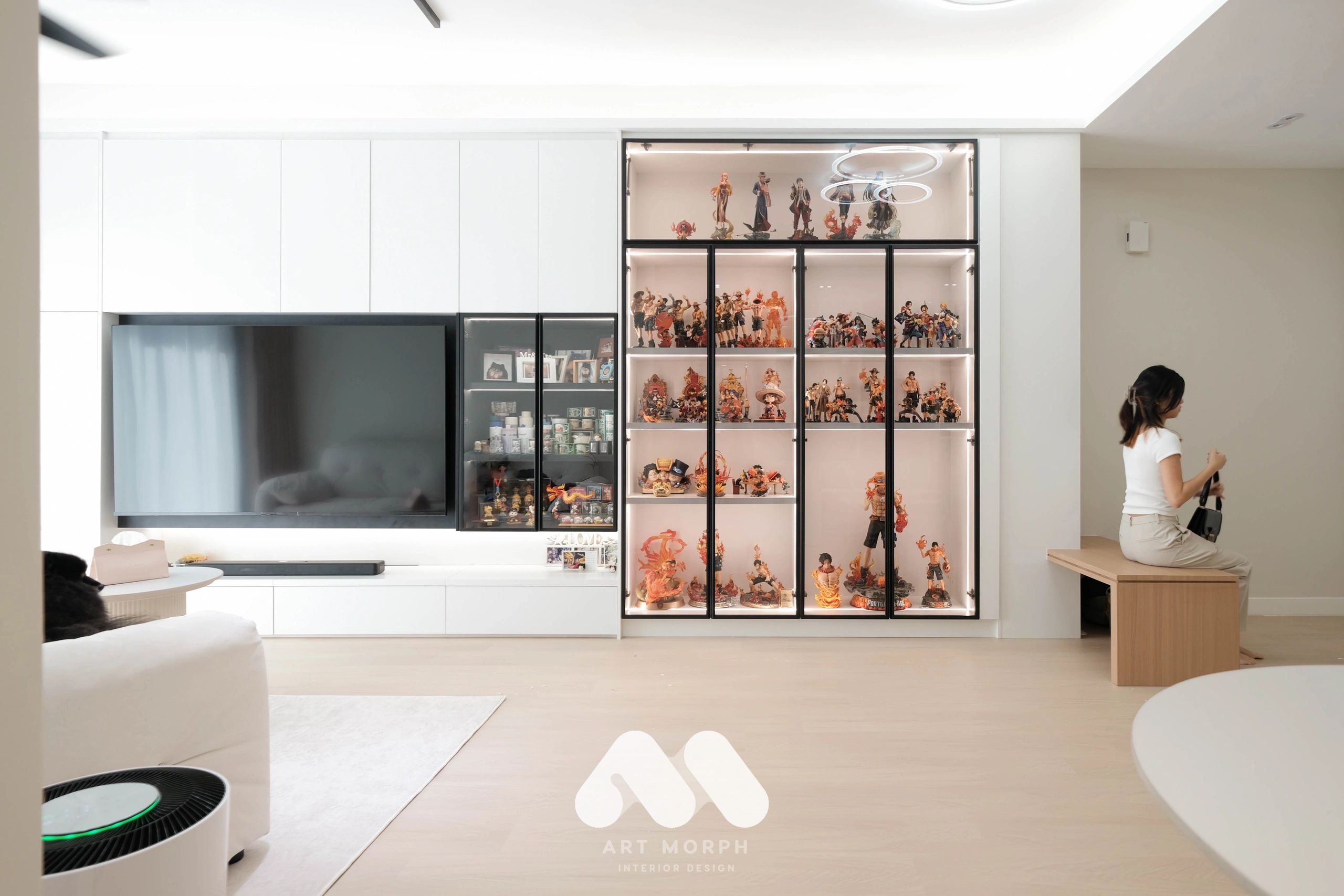 The full-height wall cabinet in the living room is the soul of the home. With cream-colored doors paired with black-framed glass displays, it balances practicality and personality. Each collectible inside — carefully arranged — reflects the homeowner’s passion and dreams made real.