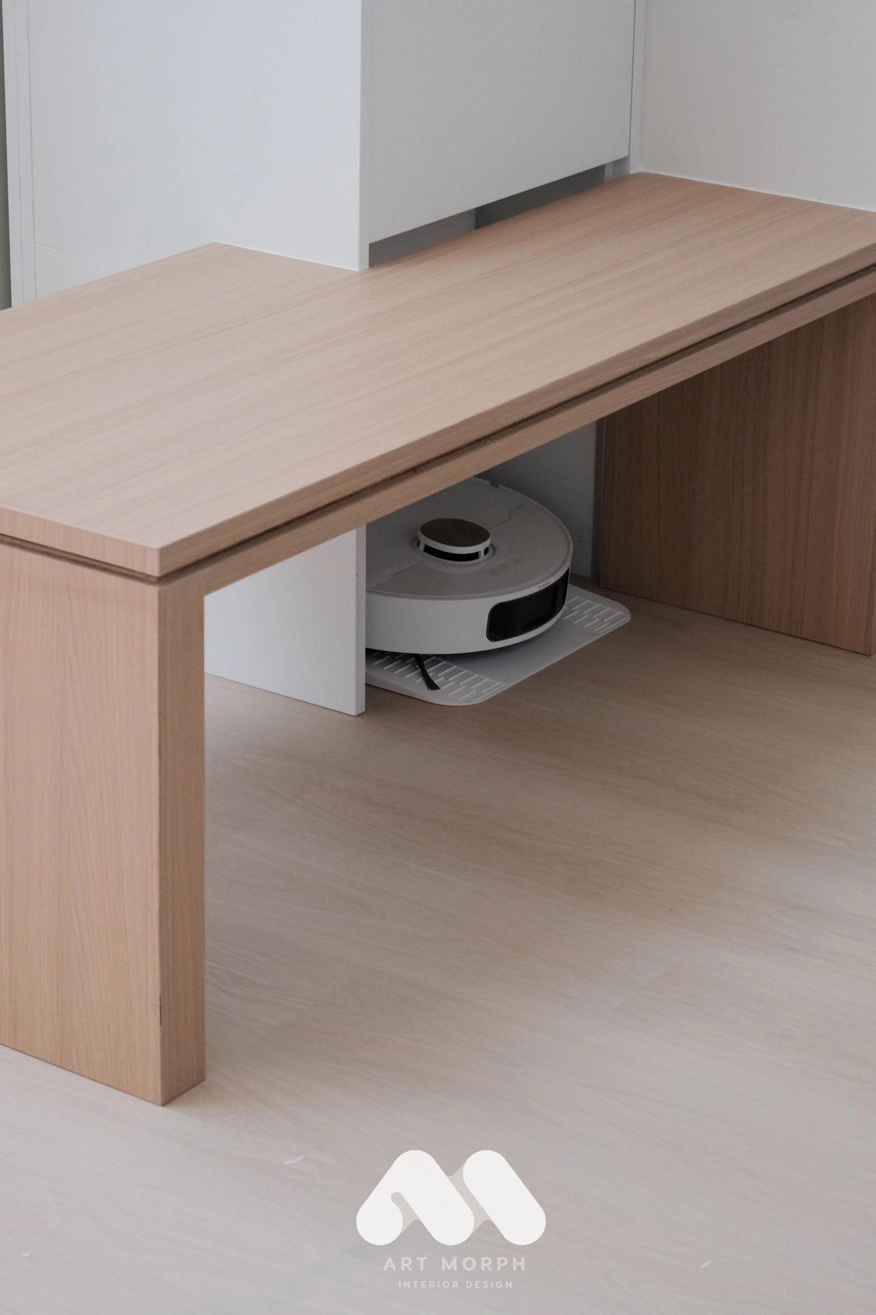 At the entrance, a small nook allows for an easy moment to sit, wear shoes, or check your outfit in the hidden full-length mirror. Even the lower cabinet was designed with a hollow base — a smart home for the robot cleaner.