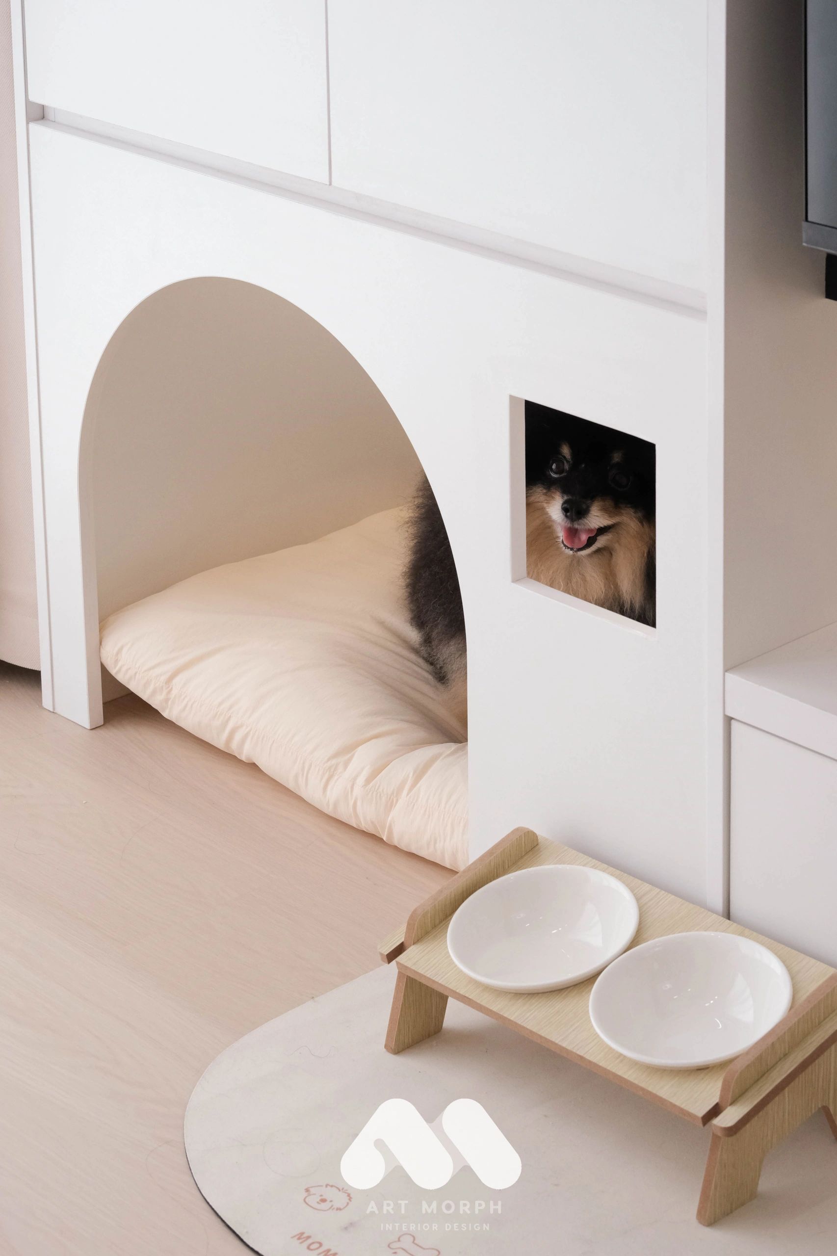 A thoughtful corner was reserved for the furry family member — a cozy hideout with a tiny door and gentle light, offering quiet companionship.
